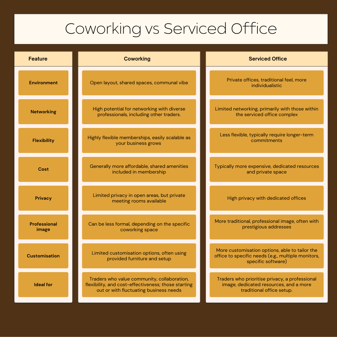 No matter your preference, both coworking and serviced offices offer viable solutions for traders seeking a professional and productive workspace. By carefully considering your individual needs and priorities, you can confidently choose the option that best supports your trading goals and helps you thrive in the financial markets.